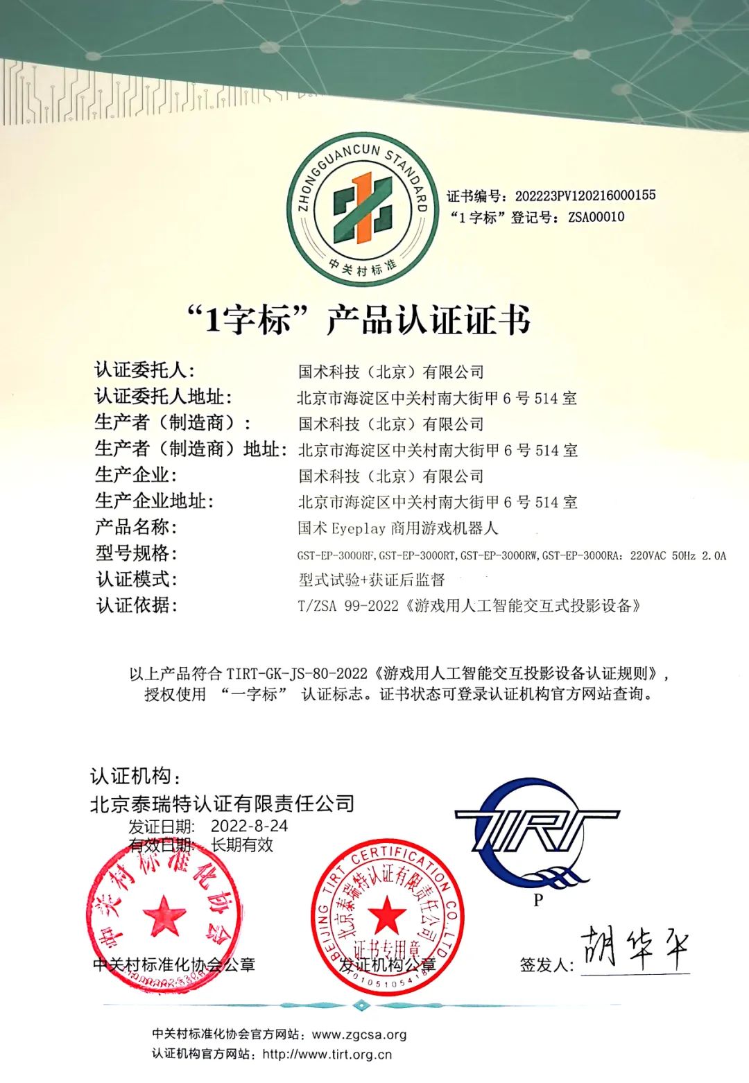 2021年,国术科技被认定为北京市“专精特新”中小企业。也是这一年,国术科技牵头制定的《游戏用人工智能交互式投影设备》团体标准入选“中关村标准”,填补了国内外该类产品标准的空白。2022年,“国术Eyeplay商用游戏机器人”获得中关村标准“1字标”产品认证。这些成果都展现出国术科技创新发展新模式的强大生命力。
