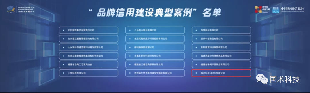 2023年12月2日-5日,由新华通讯社、海南省人民政府、中国品牌建设促进会主办的“2023中国企业家博鳌论坛”在海南博鳌隆重举行。本次论坛以“聚焦新质生产力,增强发展新动能”为主题,来自世界五百强、中国五百强及行业领军企业在内的3500多名嘉宾汇聚一堂。在4日召开的“2023新华品牌信用建设论坛”上,首次发布了“2023品牌信用建设典型案例”名单,国术科技《以“践行‘与社会共生、与用户共赢’价值观,铸就诚信品牌”》案例入选。