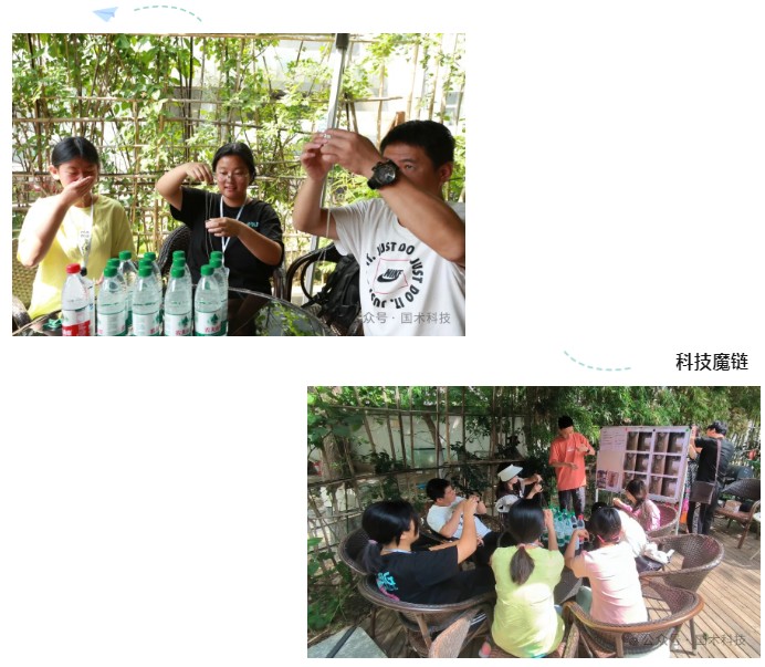 在赛未来小花园,科普老师为同学们分发了由国术科技自主研发展项——“科技魔链”的原型小道具,让大家亲身体验“圆环垂直下落时被链条套住”的小魔术。同学们惊叹,小小的“魔术”背后,竟然还有视觉暂留、拓扑学等科学原理。随后,科普老师以“科技魔链”为例,向同学们讲述了科普产品的研发及制造过程,帮助大家开阔视野。