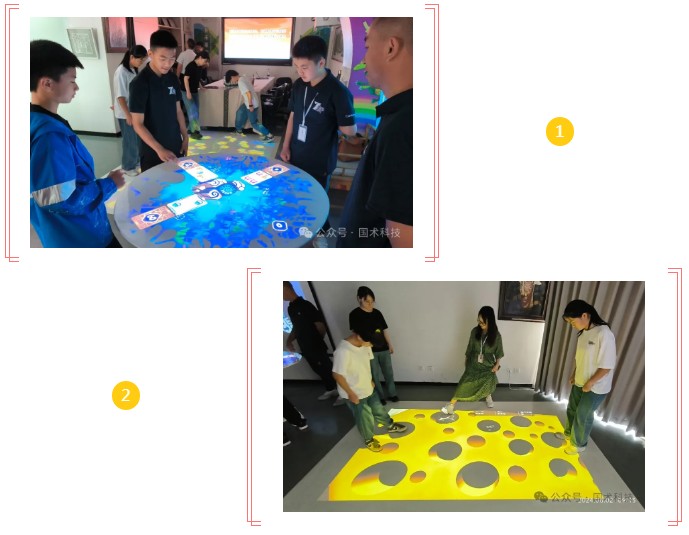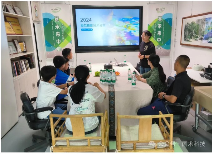 同学们一走进国术科技“赛未来中心”,就沉浸在由“赛未来商用教育游戏机器人”所营造的炫酷环境中。同学们都跃跃欲试,迫不及待地想亲身体验。在科普老师的指导下,大家体验了“丛林轶事”“怪兽牌局”“沙漠之战”等地面交互、桌面交互等科普节目。多种多样的游戏玩法、流畅无卡顿的游戏体验,给同学们留下了深刻印象,激发了大家对交互投影技术的探究欲。
