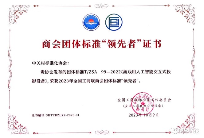 国术科技借力“一带一路”倡议,坚持走“专精特新”的高质量发展之路,成为中国科普研发和智造领域的代表性企业之一。基于多年的生产管理实践,国术科技牵头制定了《游戏用人工智能交互式投影设备》团体标准。该标准有效解决了科普行业产品普遍存在的“非标”和“定制”的痛点和难点问题,具有较大市场推广价值,填补了国内外该类产品标准的空白。2021年12月31日,该标准被中关村标准化协会认定为“中关村标准”团体标准,2023年10月被评为“2023年全国工商联商会团体标准‘领先者’”。