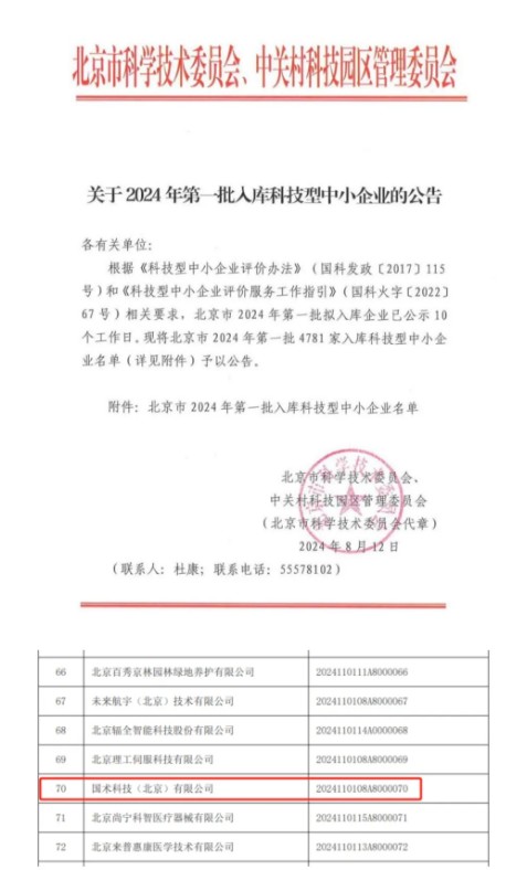 8月12日,北京市科学技术委员会、中关村科技园区管理委员会发布《关于2024年第一批入库科技型中小企业的公告》,国术科技被认定为科技型中小企业。