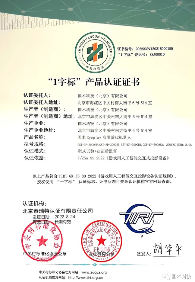 目前,国术科技采用该标准设计生产的人工智能交互投影产品包括“国术Eyeplay商用游戏机器人”“赛未来商用教育游戏机器人”“赛未来智能教育机器人”等。该类产品广泛应用于中国科学技术馆、北京科学中心、麦当劳、北京海淀区北下关街道残联等单位。2022年8月,“国术Eyeplay商用游戏机器人”获得中关村标准“1字标”产品认证。