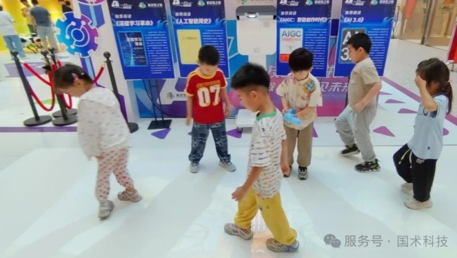 在活动晨间舱展示区域,国术科技的另一款人工智能产品——“赛未来商用教育游戏机器人”也受到小朋友们的喜爱。孩子们蹦蹦跳跳地通过脚步参与互动,既可以相互对战,也可以协同合作,玩得不亦乐乎。该产品采用了全球领先的交互投影技术和先进算法,运行流畅,能投射出丰富的趣味科普节目,营造出沉浸式的科普互动空间,不仅能够帮助孩子在健康运动中快乐学习,还能锻炼和提高孩子自身的反应能力、协调能力、思维能力和社交沟通能力。