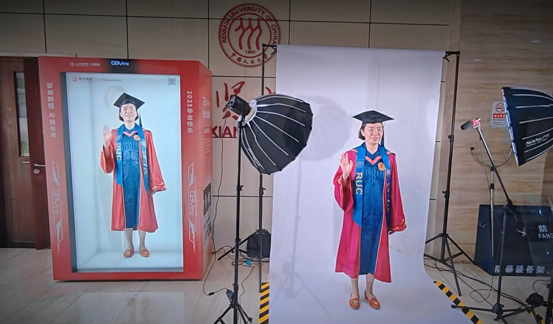 当大学校园遇见AI全息舱,会激发出怎样的创新活力?2025年6月23日,国术科技走进中国人民大学,参与人大商学院EMBA2025年毕业季活动,用“OBVerse奥比全息舱+复刻数字人”为校园增添一抹独特的科技亮色。